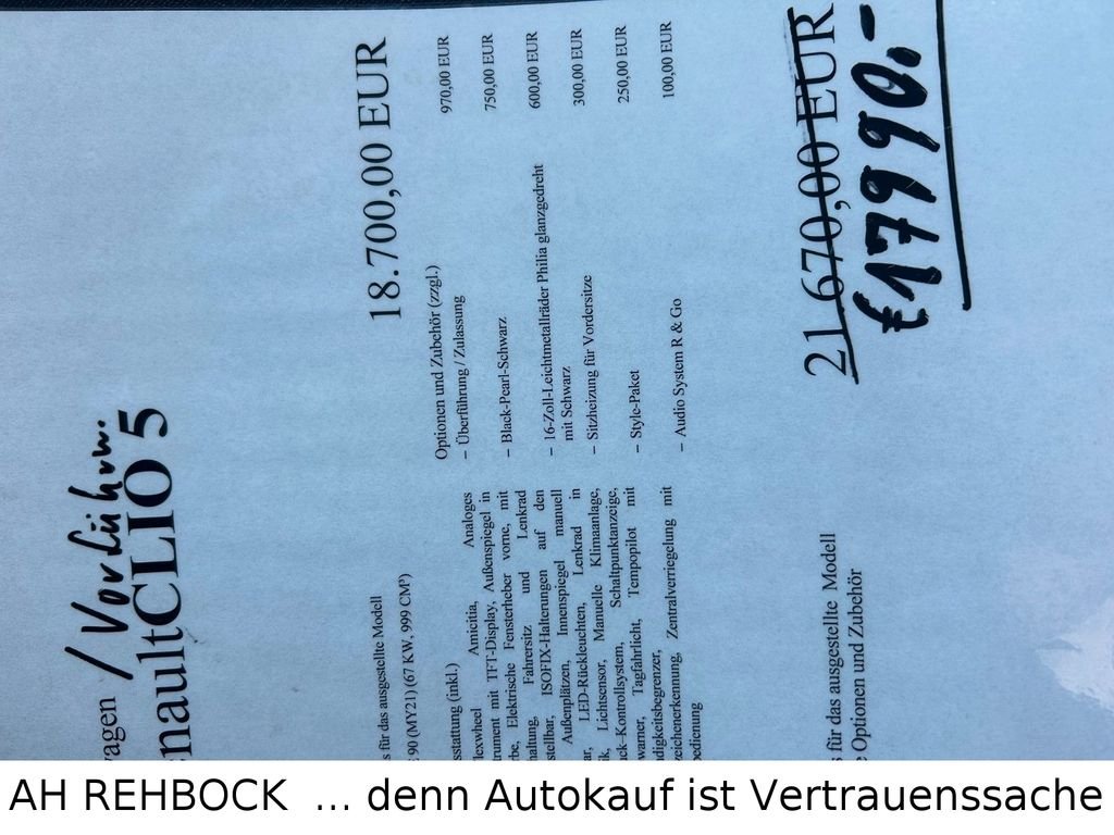 Airbag Beifahrerseite abschaltbar, Airbag Fahrer-/Beifahrerseite, Außenspiegel elektr. verstellbar, Außenspiegel schwarz, Bremsassistent, Energierückgewinnung (Energy Smart Management), Fahrassistenz-System: Aktiver Notbrems-Assistent mit Fußgängererkennung, Fahrassistenz-System: Sicherheitssystem mit automatischem Notruf (ERA GLONASS / eCall), Fahrassistenz-System: Spurwechsel-Warnsystem, Fahrassistenz-System: Verkehrszeichenerkennung, Geschwindigkeits-Begrenzeranlage, Heckleuchten LED, Heckscheibe heizbar, Isofix-Aufnahmen für Kindersitz, Karosserie: 5-türig, Kombiinstrument analog, Kopf-Airbag-System (Windowbag), Kopfstützen verstellbar, Lenksäule (Lenkrad) höhenverstellbar, Motor 1,0 Ltr. - 67 kW TCE, Paketkombination: R&GO + Klima-Paket, Reifen-Reparaturkit, Reifendruck-Kontrollsystem, Rücksitzbank geteilt/klappbar (1/3-2/3), Schadstoffarm nach Abgasnorm Euro 6d, Schaltpunktanzeige, Scheinwerfer Full-LED mit LED-Signatur (Pure Vision), Seitenairbag vorn, Sitzbezug / Polsterung: Stoff, Sonnenblenden mit Spiegel, Stahlfelgen 6,5x16 (Flexwheel), Start/Stop-Anlage, Türgriffe außen schwarz